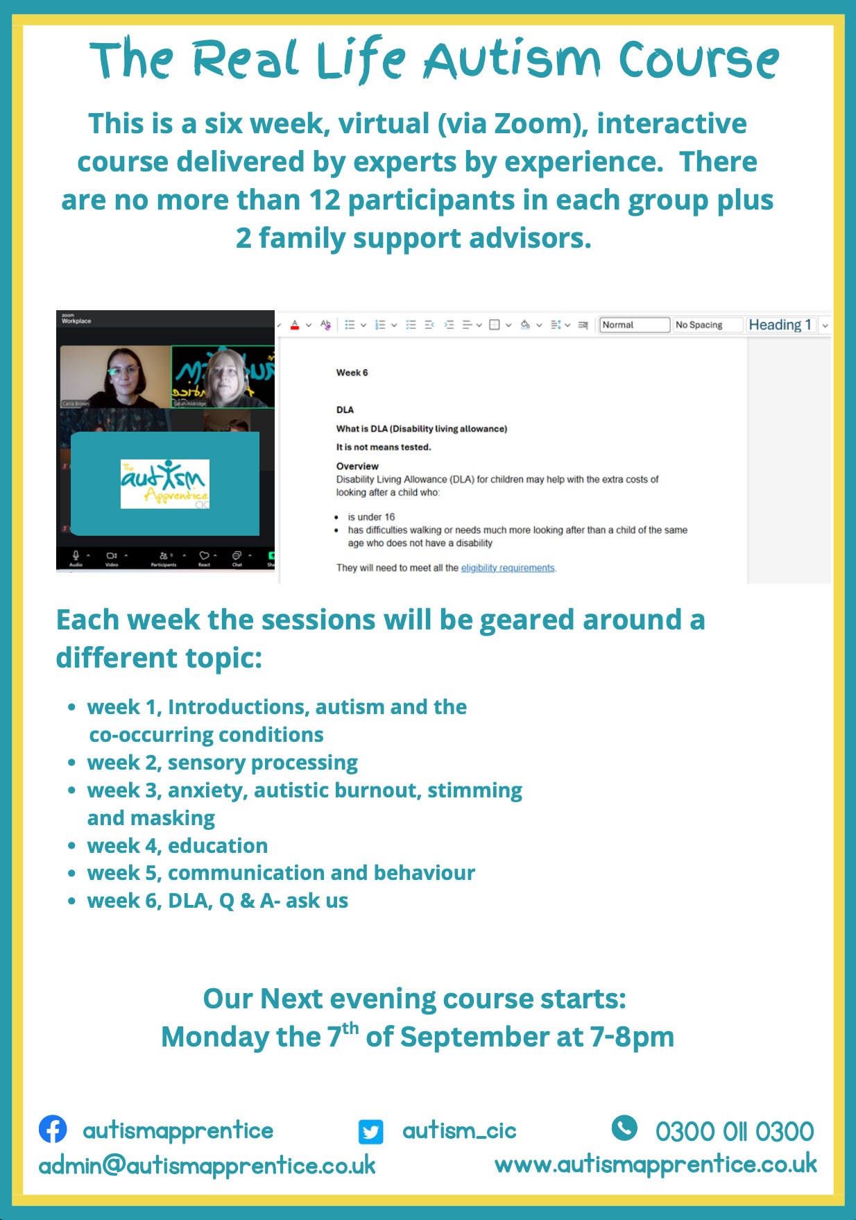 Our Real Life Autism Course is a 6-week virtual programme delivered by experts with both professional and lived experience. Designed to reflect real-life challenges, this interactive course provides practical strategies, understanding, and support that you can apply immediately.